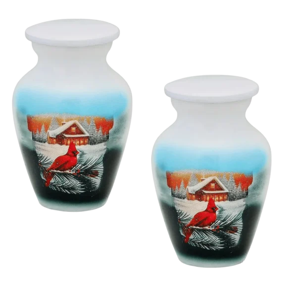 ContentThe Cardinal Keepsake Urn , from our new signature artist series, showcases a serene snowy scene with a vibrant red cardinal perched on a tree limb. This exquisite artwork captures the beauty of nature and symbolizes peace and remembrance. Crafted from 100% aluminum, the Cardinal Keepsake Urn is both durable and lightweight, ensuring the safekeeping of your loved one’s ashes. With a capacity of 3 cubic inches, this keepsake urn offers a meaningful way to hold a small portion of your loved one’s remains. As a rough estimation, one pound of pre-cremation weight is equivalent to one cubic inch of volume. Measuring 2.25 inches in height and 2 inches in diameter, the Cardinal Keepsake Urn is compact and easy to hold or display. It comes with a threaded, airtight screw-on lid, ensuring the security and preservation of the contents. As an added convenience, a complimentary carrying pouch is included with your purchase, allowing you to transport the keepsake urn with care and reverence. Honor the memory of your loved one with the Cardinal Keepsake Urn , a beautiful tribute that captures the essence of nature’s beauty and the everlasting connection you share..