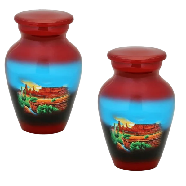 The Sonoran Desert Keepsake Urn , part of our new signature artist series, showcases a striking desert landscape bursting with vibrant colors. This unique and captivating design captures the beauty and allure of the Sonoran Desert. Made from high-quality 100% aluminum, the Sonoran Desert Keepsake Urn ensures durability and longevity, providing a secure and lasting memorial for your loved one. With a capacity of 3 cubic inches, this keepsake urn offers a meaningful way to hold a small portion of your loved one’s ashes. As a rough estimate, one pound of pre-cremation weight is equivalent to one cubic inch of volume. Measuring 2.25 inches in height and 2 inches in diameter, the Sonoran Desert Keepsake Urn is compact and easy to hold or display. It features a threaded, airtight screw-on lid, ensuring the contents remain securely sealed. For your convenience, a complimentary carrying pouch is included with your purchase, providing a safe and discreet way to transport the keepsake urn. Celebrate the spirit of the Sonoran Desert and honor the memory of your loved one with the Sonoran Desert Keepsake Urn , a beautiful and symbolic tribute that captures the essence of this remarkable landscape.